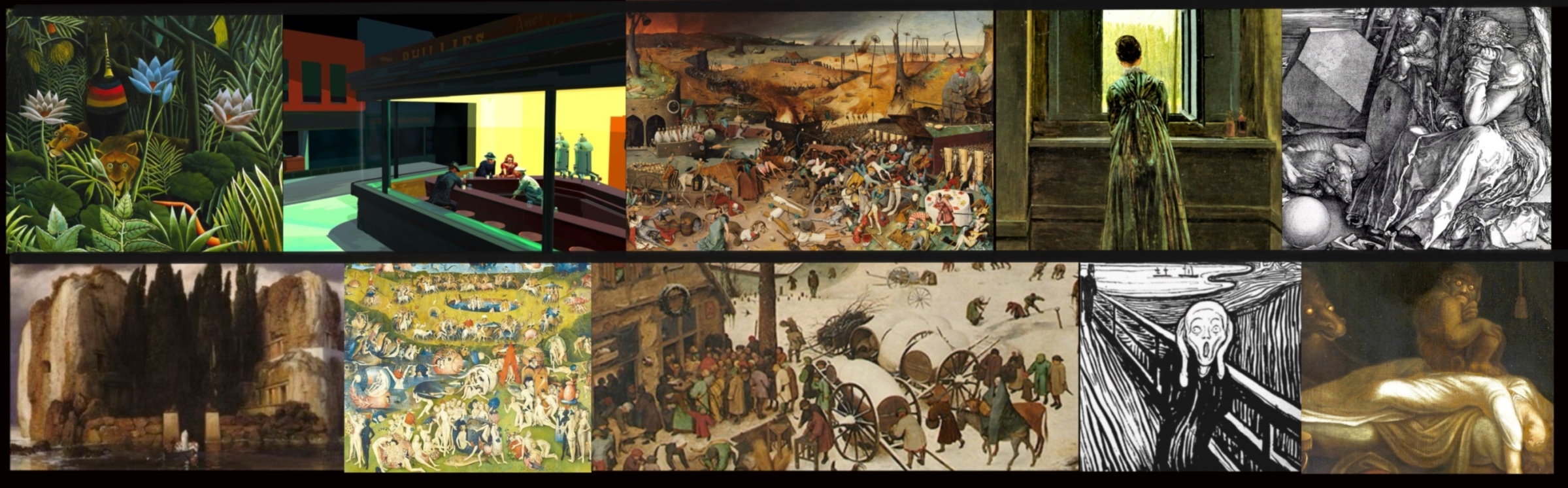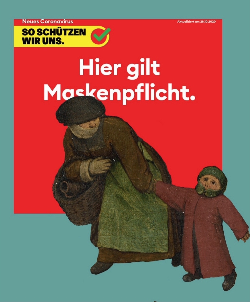 Suzannes Garten: Henri Rousseau, Le rêve (1910). - Die grosse Angst in Berns Lauben: Edvard Munch, Der Schrei (1895). - Hier gilt Maskenpflicht: Pieter Bruegel d. Ä., Volkszählung in Bethlehem (1566). -Massenbestattungen auf Hart Island, N.Y. : Pieter Bruegel d. Ä., Triumph des Todes (1562).