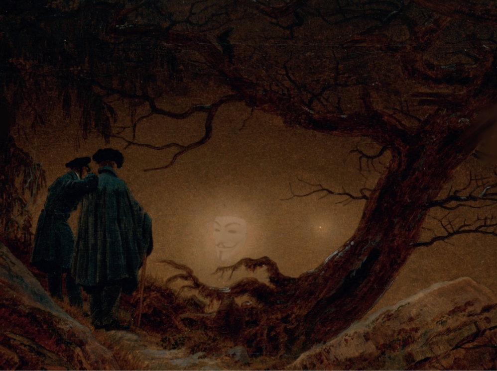 Proteste in Hongkong: Guy Fawkes-Maske und Caspar David Friedrich, Zwei Männer in Betrachtung des Mondes (ca. 1825). -