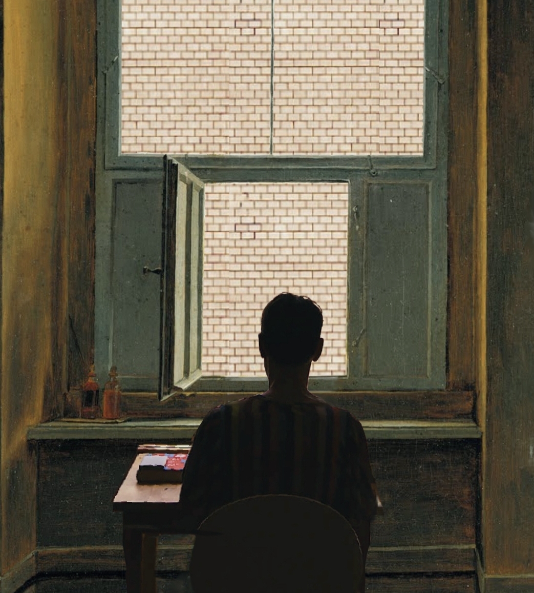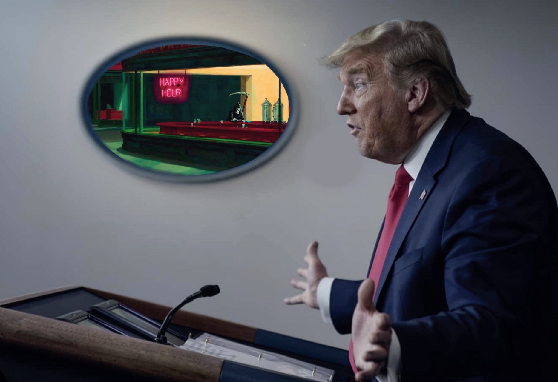 Gevatter Tod regiert: Blower-Cartoon (2018); Edward Hopper, Nighthawks (1933). - Home-office: Caspar David Friedrich, Frau am Fenster (1822); Foto: Verena Müller.