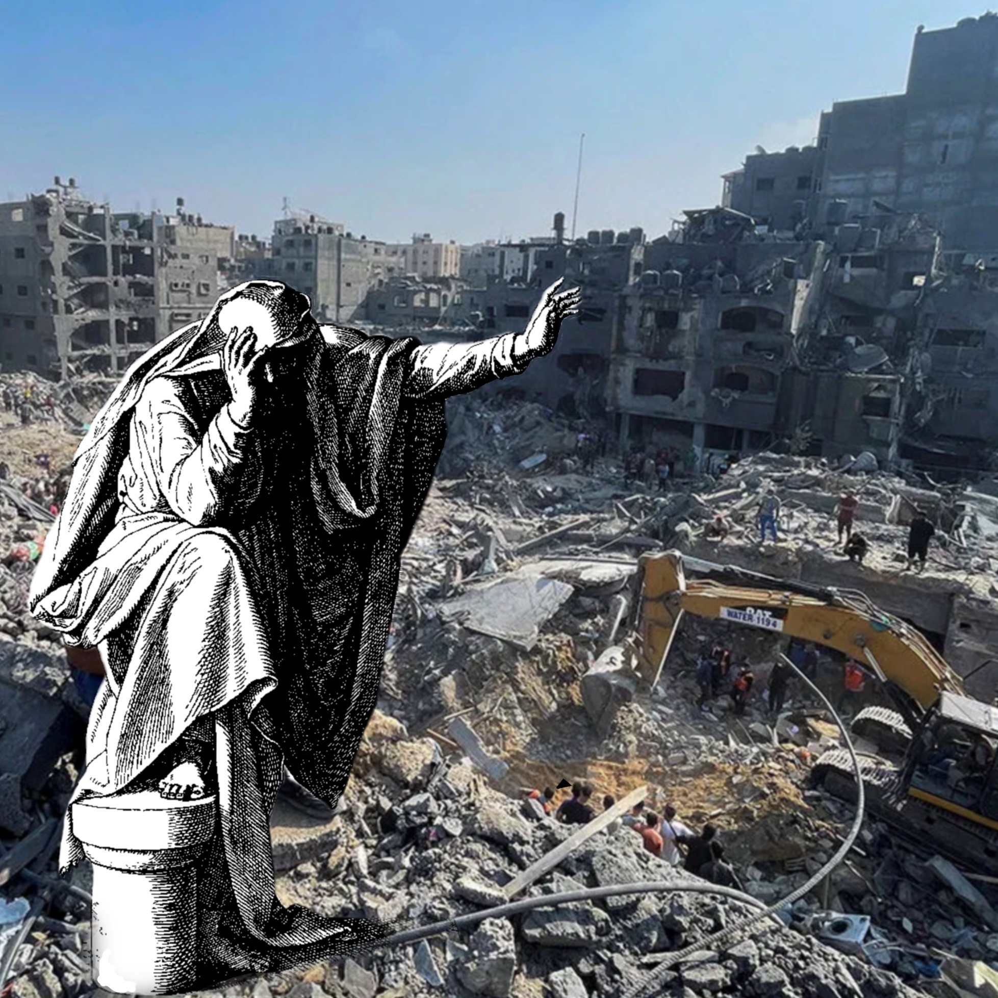 Fleeing Gaza / Jeremiah bemoans the Destruction of Gaza; Engravings: Julius Schnorr von Carolsfeld, Die Bibel in Bildern (1860); Photos: The Guardian/Anadolu/Getty - 2024f bhrs