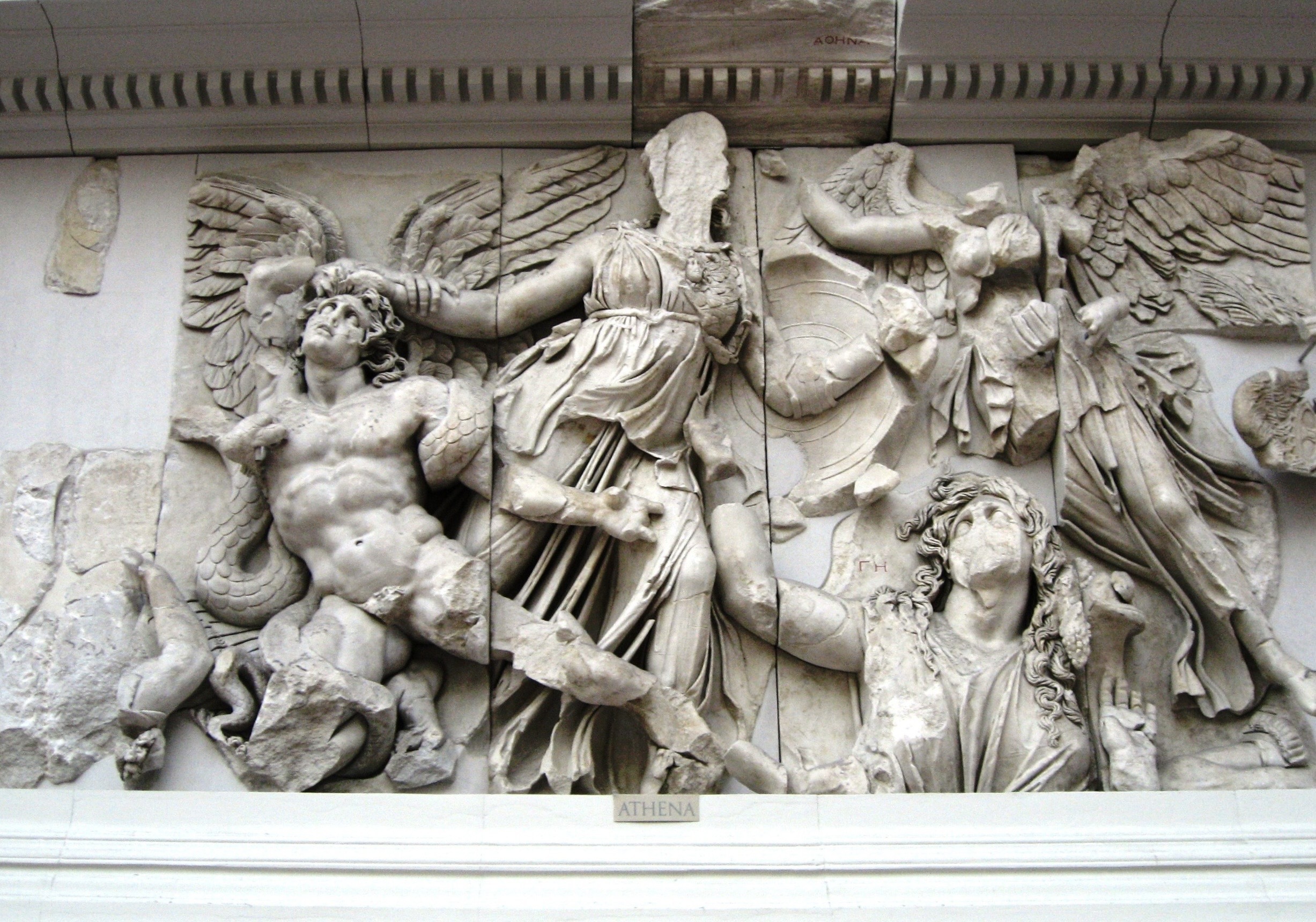 Junge Arbeiter stehen in Berlin vor dem Pergamonaltar mit seinem Fries vom Kampf der Giganten und Götter.